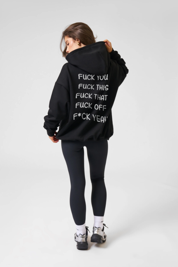 A bold text design paired with a clean black hoodie. Soft feel, strong presence, and zero interest in pleasing everyone.